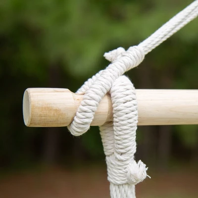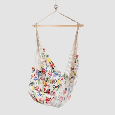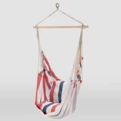 Add ultimate comfort to your backyard or patio space with this Cushioned Hammock Chair with Spreader Bar from Thresholdâ˘. Crafted from weather-resistant material for convenient outdoor use, this hammock chair comes with seat cushions for cozy lounging, while the wooden spreader bar adds extra comfort and makes it easier to climb in. Hang this cushioned hammock chair from a tree branch or porch ceiling to create a great spot to enjoy peaceful moments outdoors.