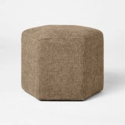 Add a striking accent piece to your living space with the Hex Upholstered Ottoman from Threshold⢠designed with Studio McGee. With an elegant, hexagonal silhouette, this decorative ottoman features an upholstered design for comfortable indoor seating. Supported on a wooden frame with tan-colored upholstery, this ottoman complements a wide variety of home decor.