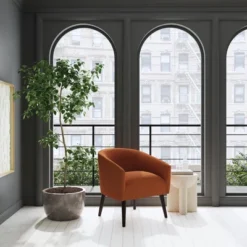 This Printers Chair in Textured Linen from Threshold⢠adds artful mid-century elegance to your space. This armed accent chair has a padded seat and a crescent-curved back for comfy seating, and it’s covered in a solid-colored linen-like fabric to add depth and refinement to your decor. Featuring a hardwood frame and standing on splayed black-finish legs, the upholstered chair can be placed anywhere in your home to add a functional and stylish accent.
