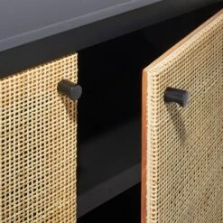 The Springville 2-Door Decorative Storage Cabinet from Threshold⢠designed with Studio McGee is as functional as it is beautiful. This wooden cabinet has a dark brown silhouette paired with rattan-like woven doors in light beige to provide a timeless, textured look that complements a variety of furniture styles and color palettes. It opens up to ample concealed, organizational space with shelves for storing items ranging from table linens in your dining room to board games in your living room, while its smooth tabletop provides a perfect platform for displaying framed photos, potted plants, accent lamps or other decorative items.